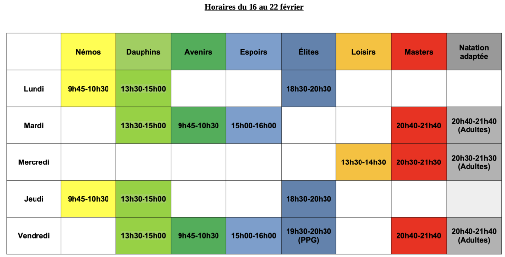 Les Némos auront 2 séances et passeront l’ASNS (Attestation du Savoir Nager en Sécurité). Les Némos auront par contre 4 séances aux prochaines vacances (Avril).